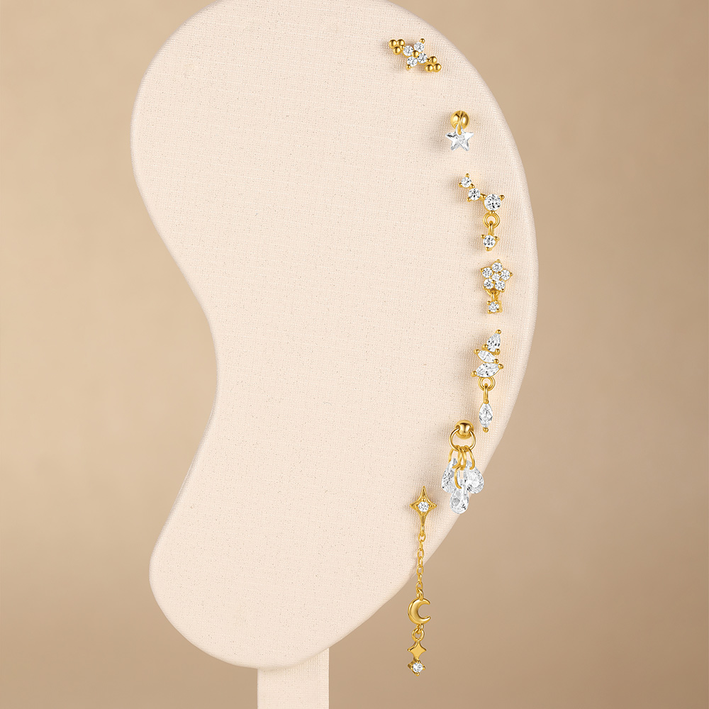 Enhance your style with this elegant 925 Sterling Silver Star Moon Cartilage Earring, designed for women who love trendy and minimalist jewelry. This unique piece features a delicate star, moon, and lotus tassel design, beautifully crafted with high-quality zircon stone and finished in 18K gold plating for a luxurious shine.